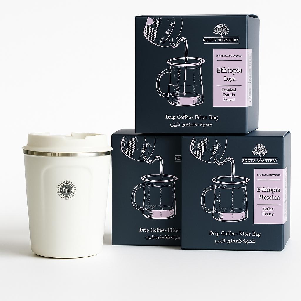 A set of (3) boxes of different drip coffee bags (Brazil – Ethiopia – Colombia) with a thermo mug for 12 hours