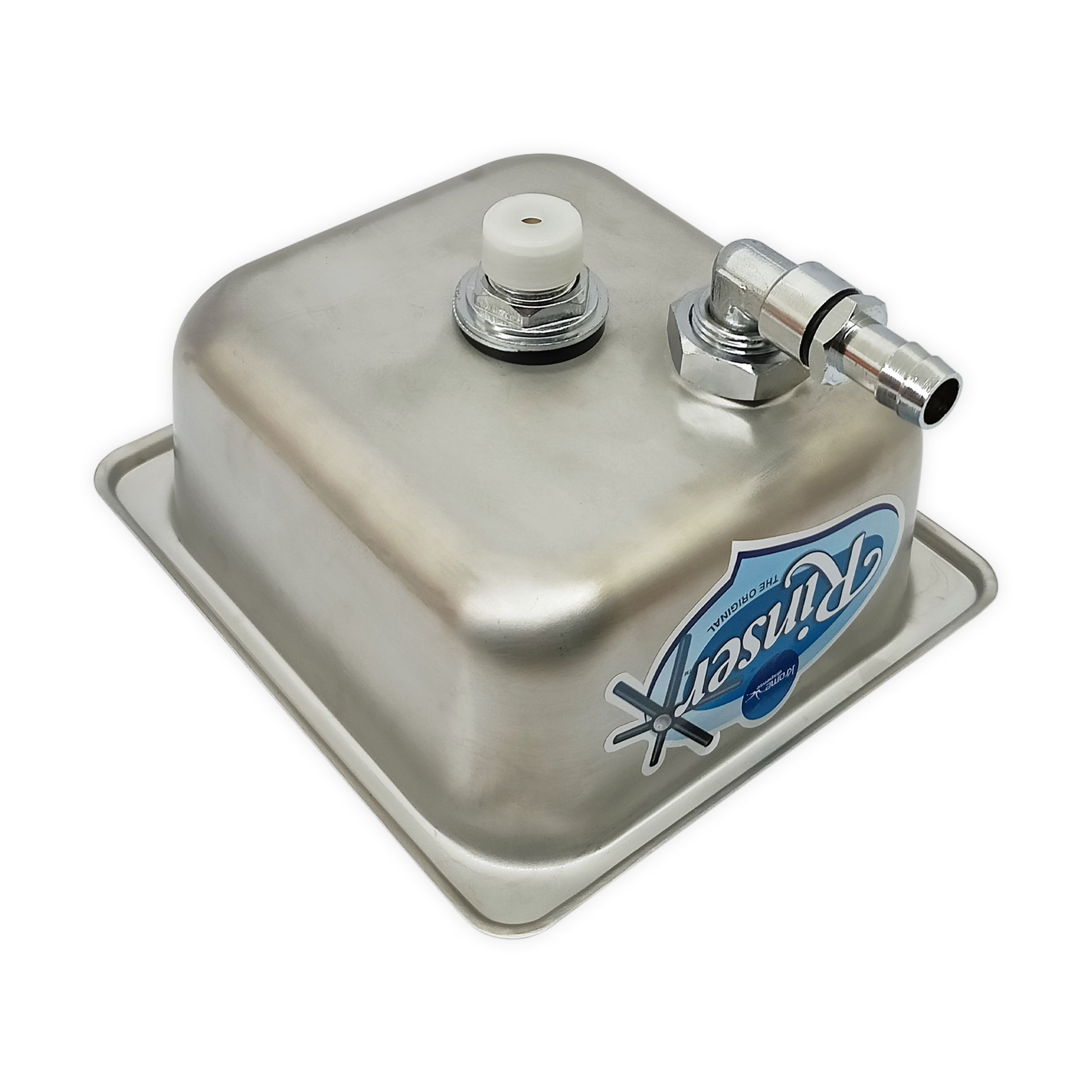 Flush mount pitcher rinser for new or refurbished counter. Cut out part of counter to the rinser dimensions and fit this in. Hides away all water and drain line pipe connections from view.
